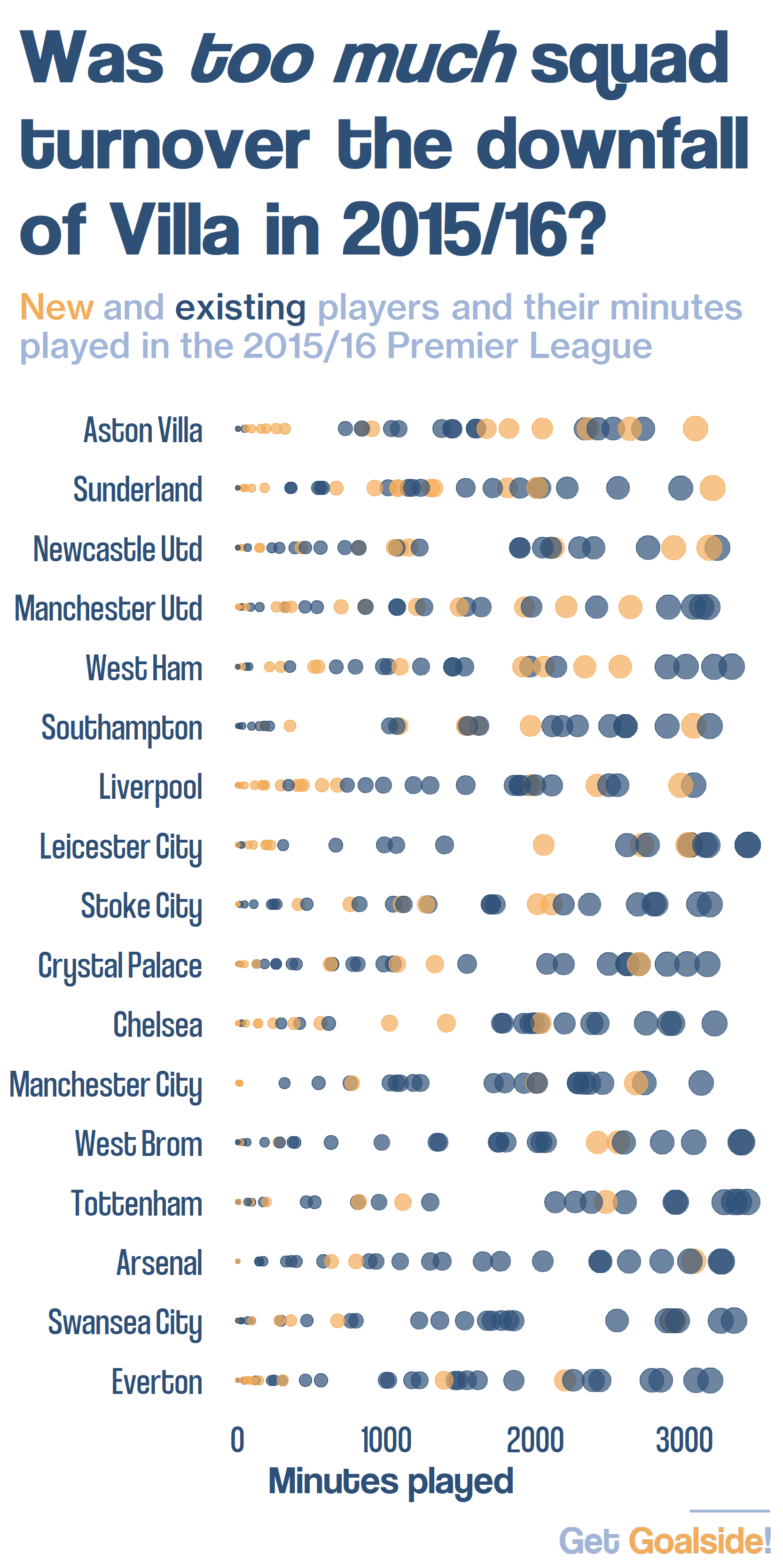Nearly 44% of Villa’s minutes in the 2015/16 Premier League season were played by people who hadn’t played at all the previous campaign. This was ahead of the second-highest figure by seven percentage points.